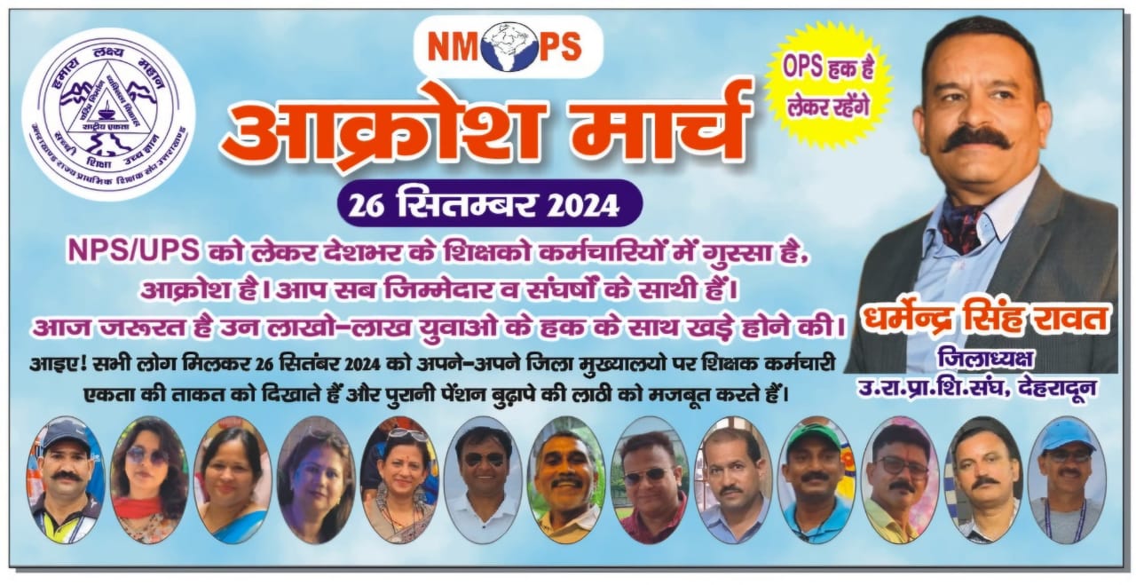 NMOPS की राष्ट्रीय कार्यकारिणी के अहवाहन पर उत्तराखंड राज्य प्राथमिक शिक्षक संघ, देहरादून के जिलाध्यक्ष धर्मेन्द्र सिंह रावत के नेतृत्व में जनपद के शिक्षको द्वारा जनपद में चल रही प्रारंभिक जनपद स्तरीय क्रीड़ा एवम सांस्कृतिक प्रतियोगिता के भोजन अवकाश के समय पर पुरानी पेंशन बहाली हेतु जन आक्रोश मार्च का आयोजन किया गया ।
