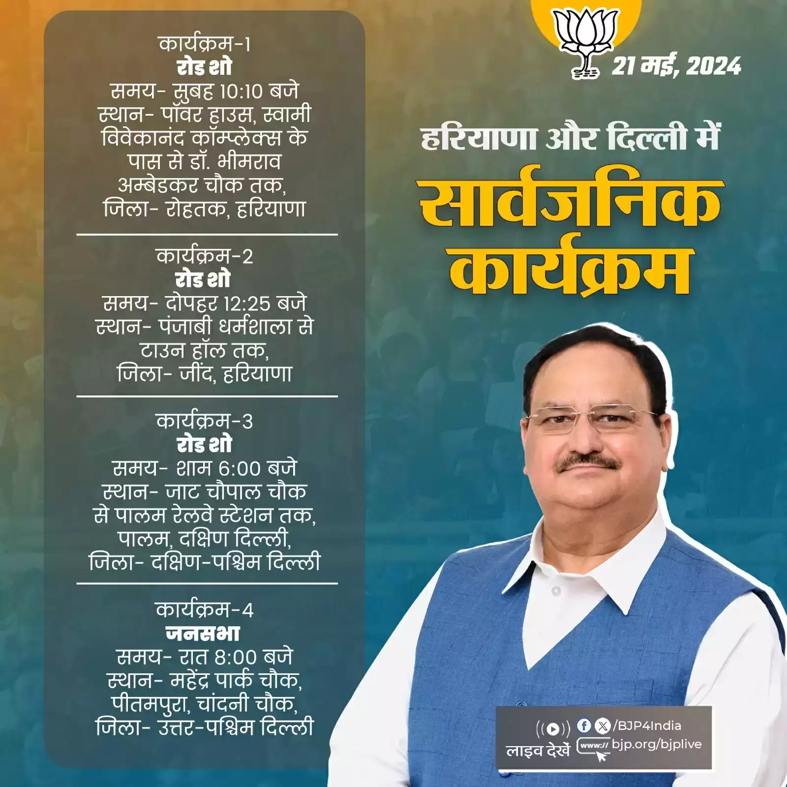 भाजपा के एक्स हैंडल के अनुसार नड्डा आज चुनाव प्रचार की शुरुआत हरियाणा के रोहतक से करेंगे। यहां उनका रोड शो सुबह 10ः10 बजे शुरू होगा। यहां से वह जींद पहुंचेंगे। जींद में नड्डा का रोड शो दोपहर 12ः15 बजे शुरू होगा। जींद से नड्डा सीधे दिल्ली के लिए रवाना होंगे। यहां वह शाम छह बजे दक्षिण पश्चिम दिल्ली जिला में आयोजित रोड शो में शामिल होंगे। यह रोड शो जाट चौक चौपाल से पालम रेलवे स्टेशन तक निकलेगा। रोड शो करने के बाद नड्डा पीतमपुरा पहुंचेंगे। पीतमपुरा के महेंद्र पार्क चौक पर वह रात आठ बजे जनसभा को संबोधित करेंगे।