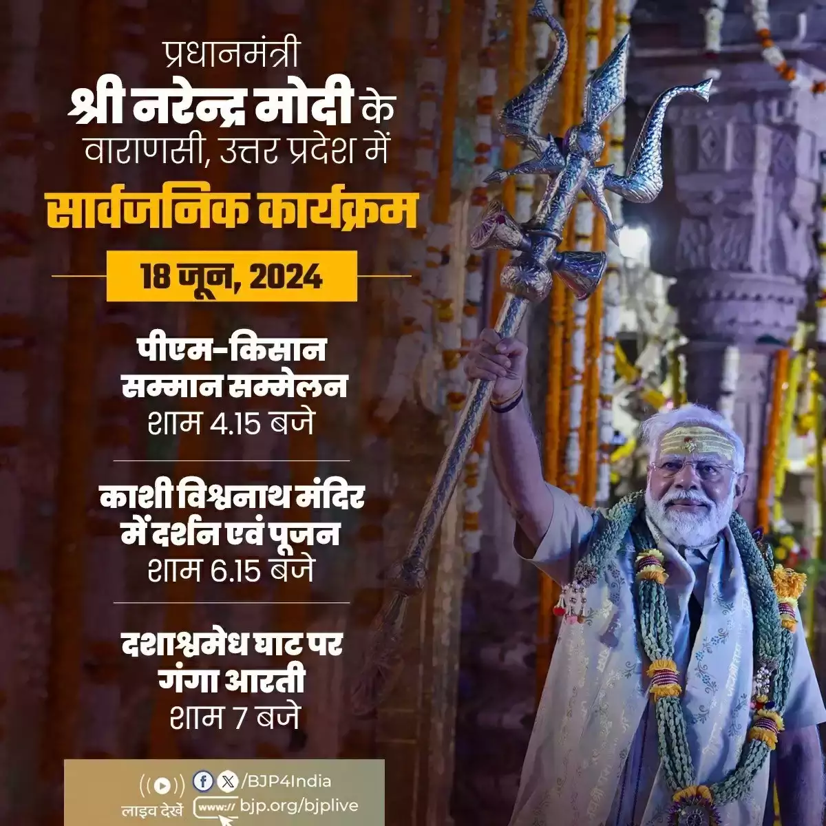 प्रधानमंत्री नरेन्द्र मोदी आज अपने संसदीय क्षेत्र वाराणसी (उत्तर प्रदेश) पहुंच रहे हैं। प्रधानमंत्री वाराणसी से पीएम-किसान योजना के तहत लगभग 20,000 करोड़ रुपये की 17वीं किस्त जारी करेंगे। 17वीं किस्त से 9.26 करोड़ से अधिक किसानों को 20,000 करोड़ रुपये से अधिक का लाभ मिलेगा। भारतीय जनता पार्टी (भाजपा) ने एक्स हैंडल पर प्रधानमंत्री नरेन्द्र मोदी के वाराणसी में होने वाले सार्वजनिक कार्यक्रम को साझा किया है। भाजपा के एक्स हैंडल पर उपलब्ध ब्योरे के अनुसार, प्रधानमंत्री मोदी वाराणसी में आज शाम 4ः15 बजे पीएम किसान सम्मेलन में हिस्सा लेंगे। इसके बाद शाम 6ः15 बजे काशी विश्वनाथ मंदिर पहुंचकर दर्शन-पूजन करेंगे। 45 मिनट बाद प्रधानमंत्री मोदी मां गंगा के दर्शन करने दशाश्वमेध घाट पहुंचेंगे। वो इस घाट पर होने वाली भव्य गंगा आरती में हिस्सा लेंगे।