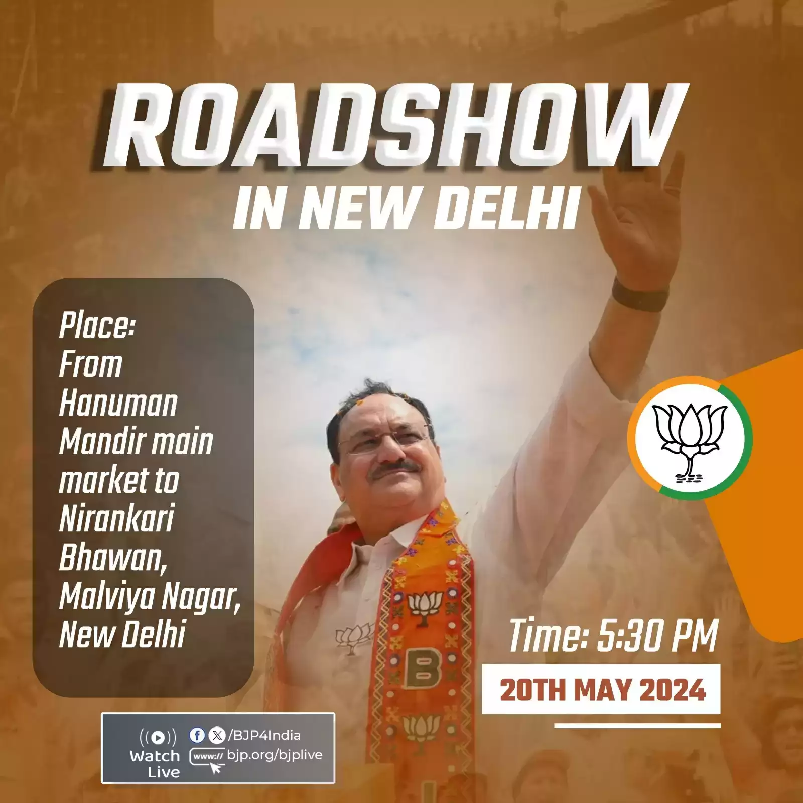 भाजपा के एक्स हैंडल के अनुसार नड्डा आज शाम राष्ट्रीय राजधानी दिल्ली के मालवीय नगर में पार्टी उम्मीदवार के पक्ष में प्रचार करेंगे। नड्डा शाम साढ़े पांच बजे यहां रोड शो करेंगे। उनका रोड शो हनुमान मंदिर मेन मार्केट से शुरू होगा। इसका समापन निरंकारी भवन में होगा।