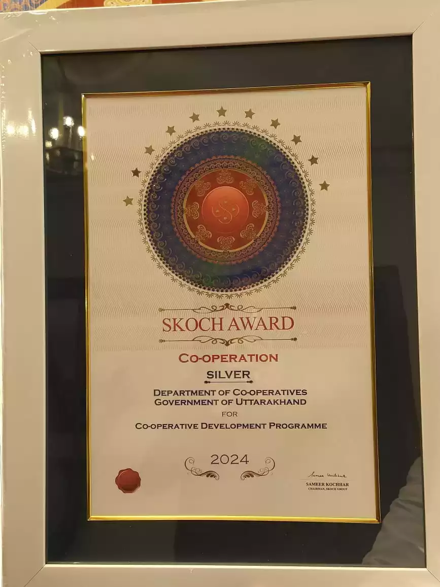 डॉ. रावत ने कहा कि स्कॉच सिल्वर अवार्ड के माध्यम से सहकारिता विभाग के प्रयासों को मान्यता मिलना उत्तराखंड के किसानों और ग्रामीणों की आमदनी दोगुनी, सेवा करने के प्रति सम्पूर्ण विभाग की प्रतिबद्धता की पुष्टि है। यह विभाग के लिए प्रयासों को जारी रखने और क्षेत्र में अपनी पहुंच व प्रभाव को और बढ़ाने के लिए एक प्रेरणा के रूप में कार्य करेगा।