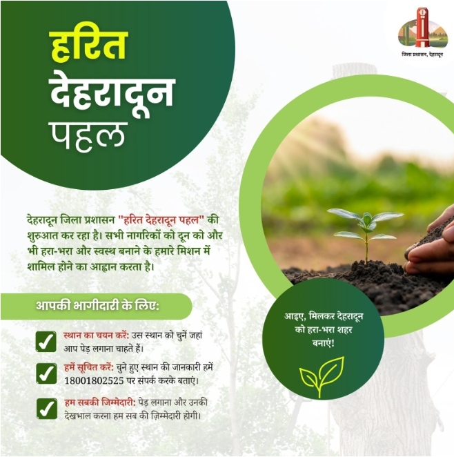 जिलाधिकारी श्रीमती सोनिका के निर्देशन में देहरादून जिला प्रशासन “हरित देहरादून पहल” की शुरुआत कर रहा है। जिलाधिकारी के नेतृत्व में जिला प्रशासन देहरादून द्वार सभी नागरिकों को दून को और भी हरा-भरा और स्वस्थ बनाने के हमारे मिशन में शामिल होने का आह्वान किया है।